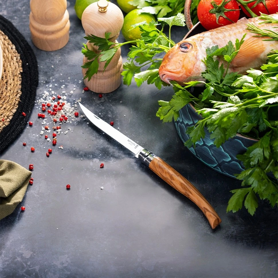 Нож Opinel №12 обладает более узким и гибким лезвием, чем традиционные модели, поскольку предназначен для таких тонких кулинарных операций как разделка рыбы, мяса и птицы. Обтекаемая рукоять из оливкового дерева создана для комфортного удержания ножа в руке. А благодаря складной конструкции и легкому весу его удобно брать с собой в любые поездки на природу.